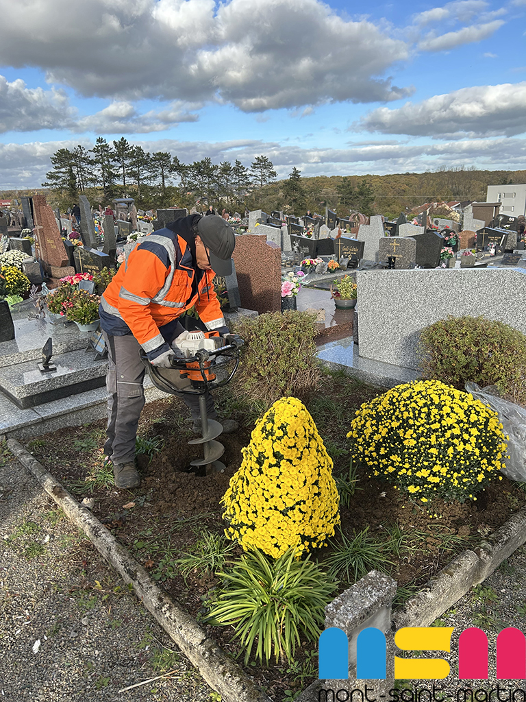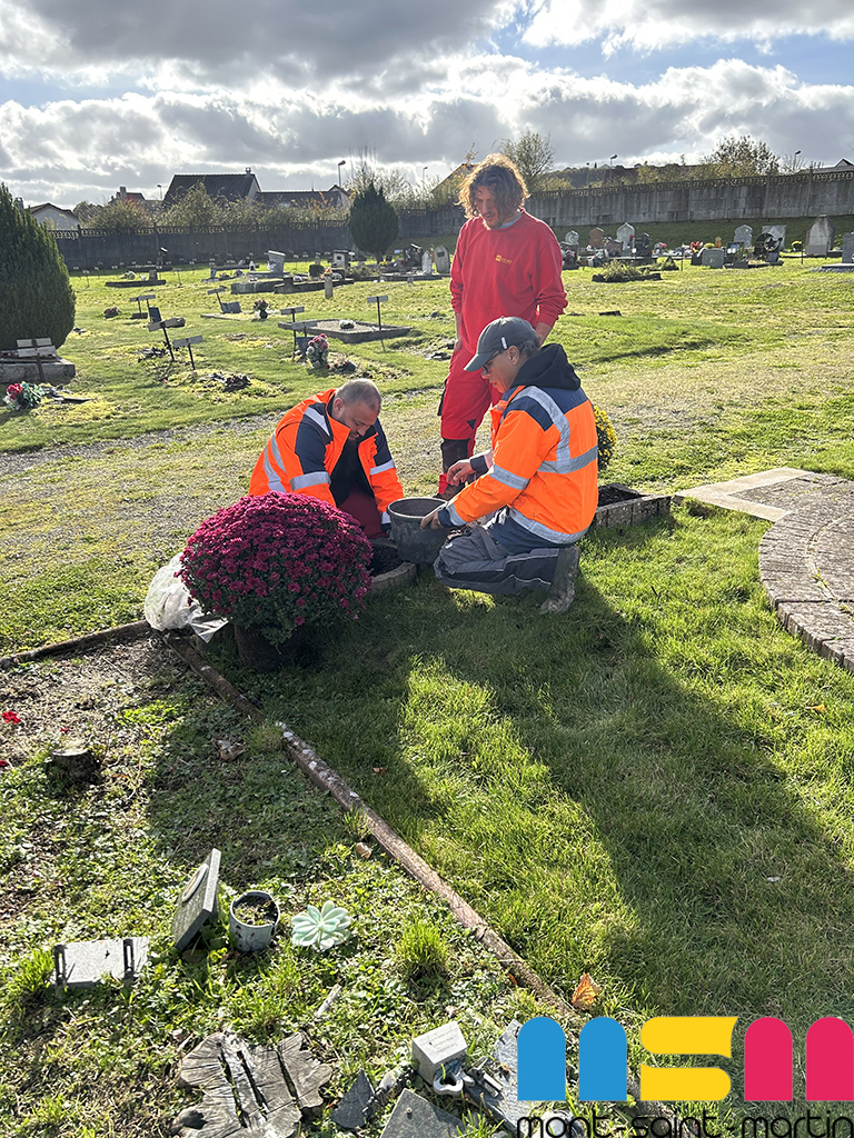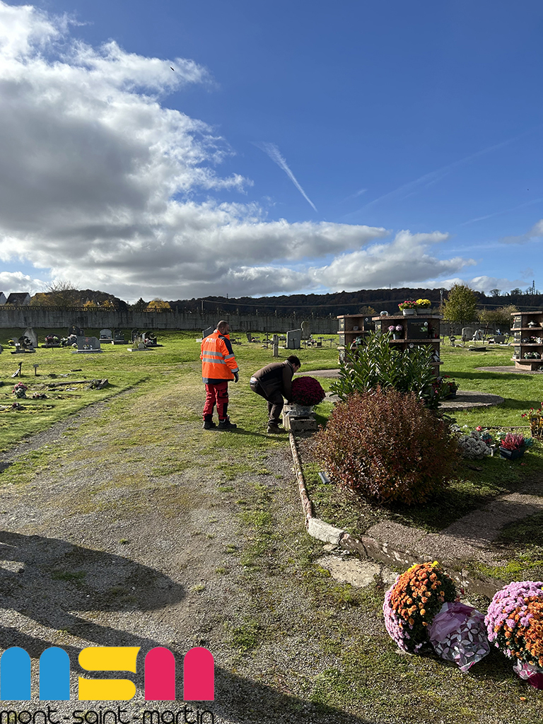 Depuis plusieurs semaines, les agents municipaux sont mobilisés dans les deux cimetières de Mont-Saint-Martin afin d’assurer la propreté et l’embellissement des lieux. Au programme : désherbage des allées, ramassage des feuilles mortes, dépôts de fleurs. L’objectif est de rendre le site accueillant et de permettre aux habitants — notamment le jour de la Toussaint — de venir se recueillir et d’honorer les défunts.