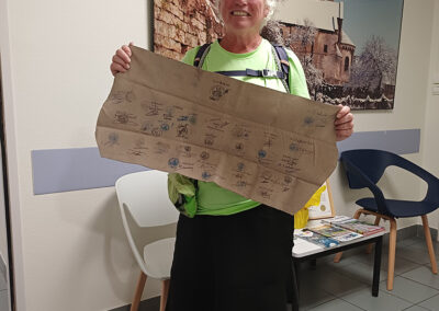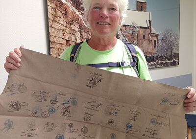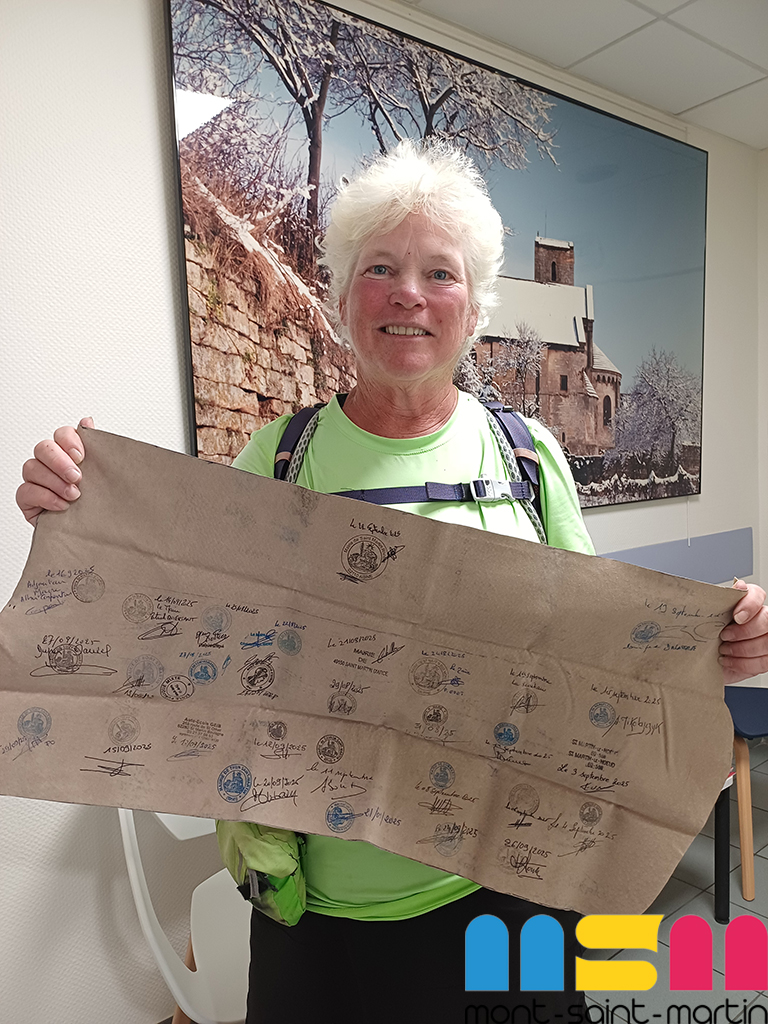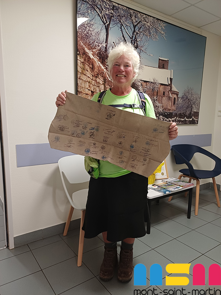 C’est à la mairie de Mont-Saint-Martin qu’Ann Sieben, pèlerine américaine, a fait étape le 29 septembre. Ancienne ingénieure nucléaire, elle a choisi de consacrer sa vie à la marche et aux échanges avec les habitants.