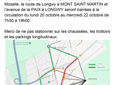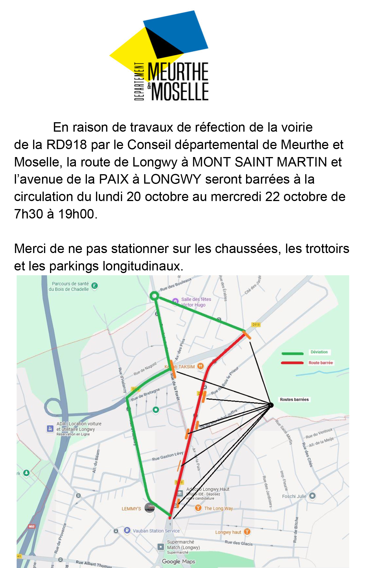 En raison des travaux effectués sur la RD918 par le Conseil départemental de Meurthe-et-Moselle, la route de Longwy à MONT-SAINT-MARTIN et l’avenue de la Paix à LONGWY seront barrées à la circulation du lundi 20 octobre au mercredi 22 octobre de 7h30 à 19h00.